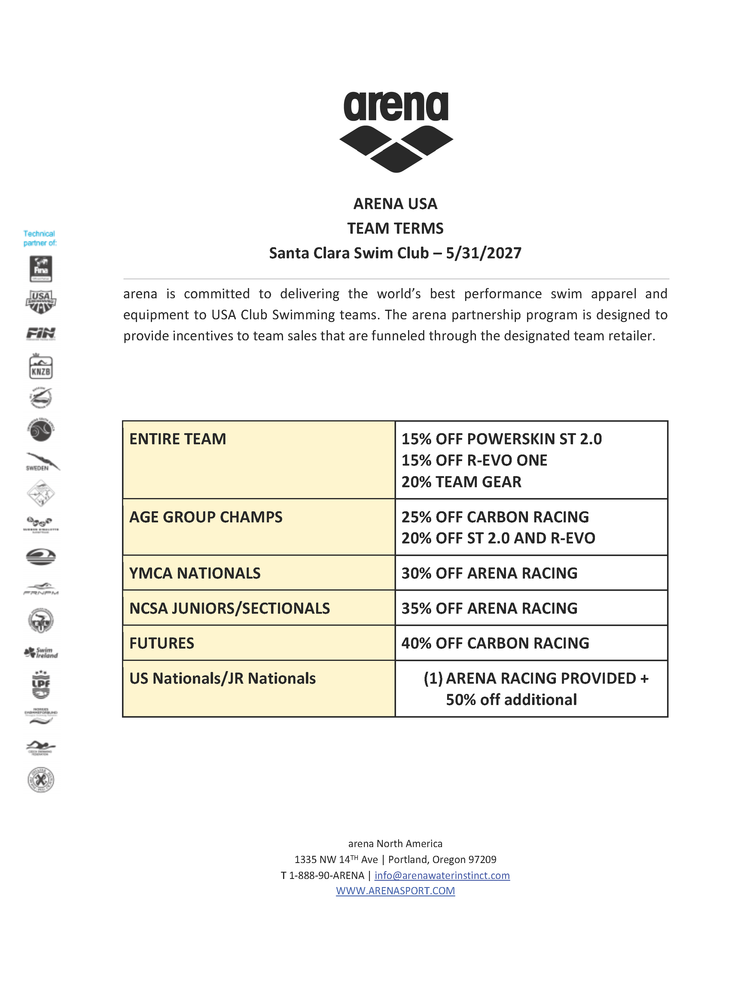 SCSC receives a discount on Arena tech suits. See the details below and order directly by emailing Tomas Mendez at SwimOutlet. Please let him know what your highest qualifying meet level is when emailing him.